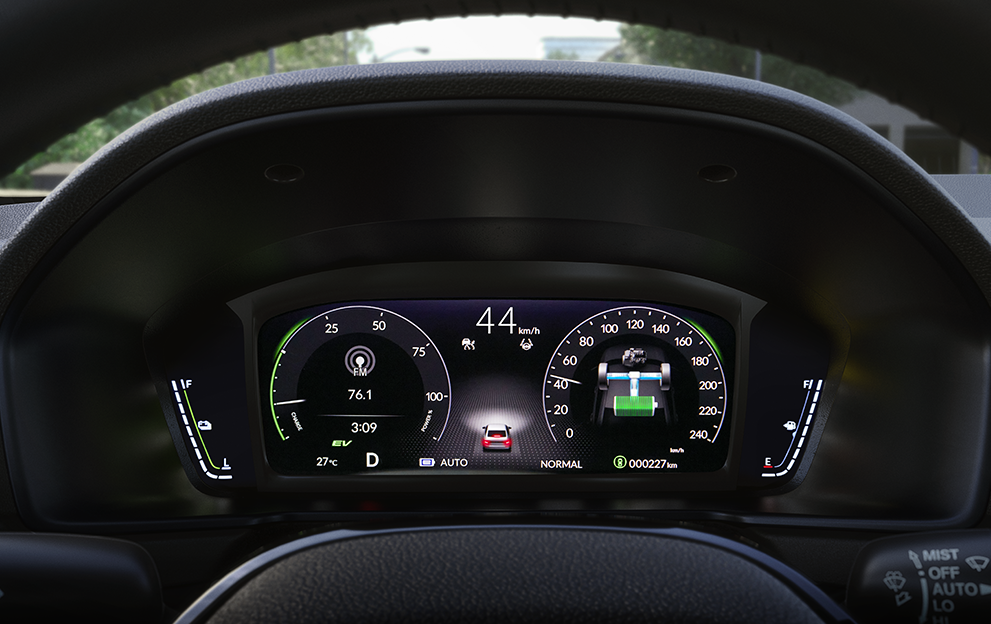 Um sistema híbrido muito mais elétrico. A exclusiva tecnologia Honda e:HEV combina de forma eficiente a motorização elétrica e a combustão, garantindo mais potência com menos consumo de combustível.